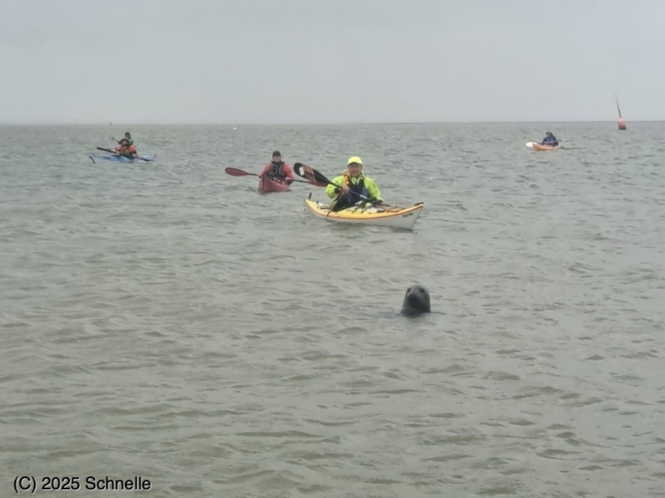 Nach einem geselligen Abend mit gemeinsamem Grillen am Bootshaus des WSV Norden ging es Sonntagmorgen nach Neßmersiel, wo die Boote über den Steg des Yachthafens wesentlich einfacher als tags zuvor zu Wasser gelassen werden konnten. Bei Nieselregen und 5 Bft. Gegenwind aus nördlicher Richtung ging es zu einem kleinen Sandstrand westlich des Baltrumer Hafens. Um den Fähren und anderen Wasserfahrzeugen wieder aus dem Weg zu gehen paddelte die Gruppe neben dem betonnten Fahrwasser entlang der Sandbänke. Als auf einer Sandbank eine große Gruppe Seehunde auftauchte, musste das Fahrwasser gequert werden, um die Seehunde nicht aufzuschrecken. Einige neugierige Seehund kamen dennoch ins Wasser und begleiteten die Gruppe bis zum Strand von Baltrum.